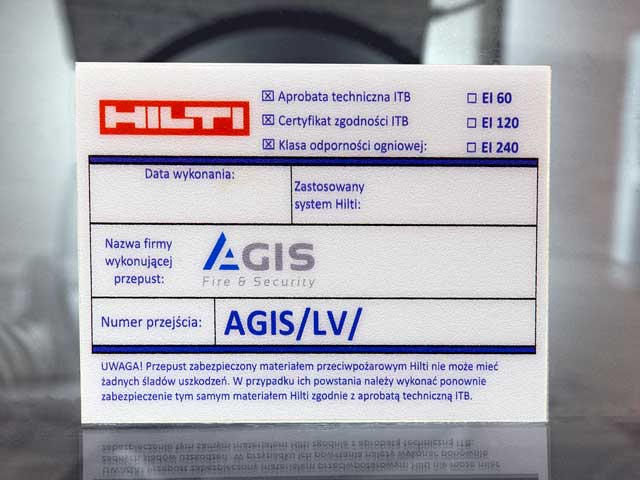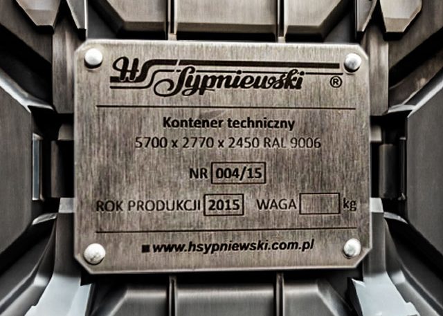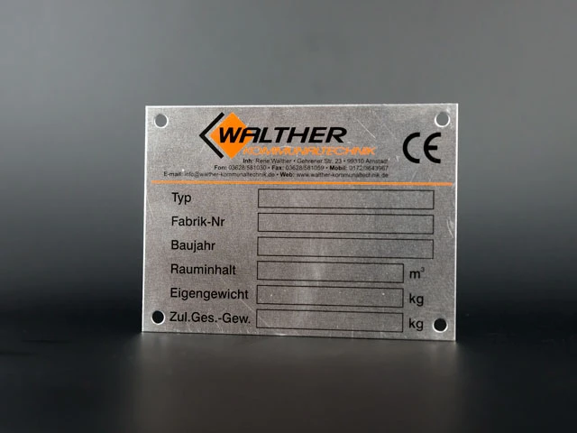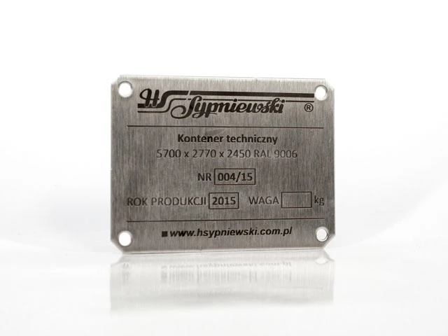 Podłoże: blacha nierdzewna dowolnej grubości, nadruk farbą chemoutwardzalną, lub grawer laserem YAG. Mocowanie: otwory na śrubki, nity itp. lub warstwa samoprzylepna.