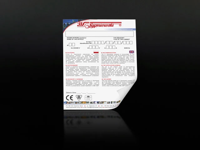 Podłoże: plastik biały, kolor lub bezbarwny dowolnej grubości, nadruk farbą chemoutwardzalną. Mocowanie: warstwa samoprzylepna.