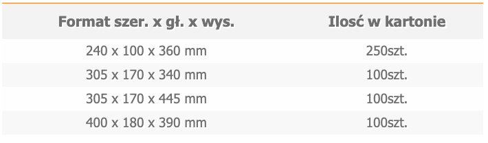 Torby papierowe wykonane z papieru pochodzącego w 100% z recyklingu, gramatura papieru od 70 do 100 g/m2. Papier, z którego robione są torby posiada atesty do kontaktu z żywnością. Wytrzymałość sklejenia podstawy i uchwytu to ok. 5-8kg. W ofercie mamy papier biały i brązowy gładki lub prążkowany.